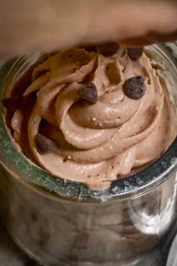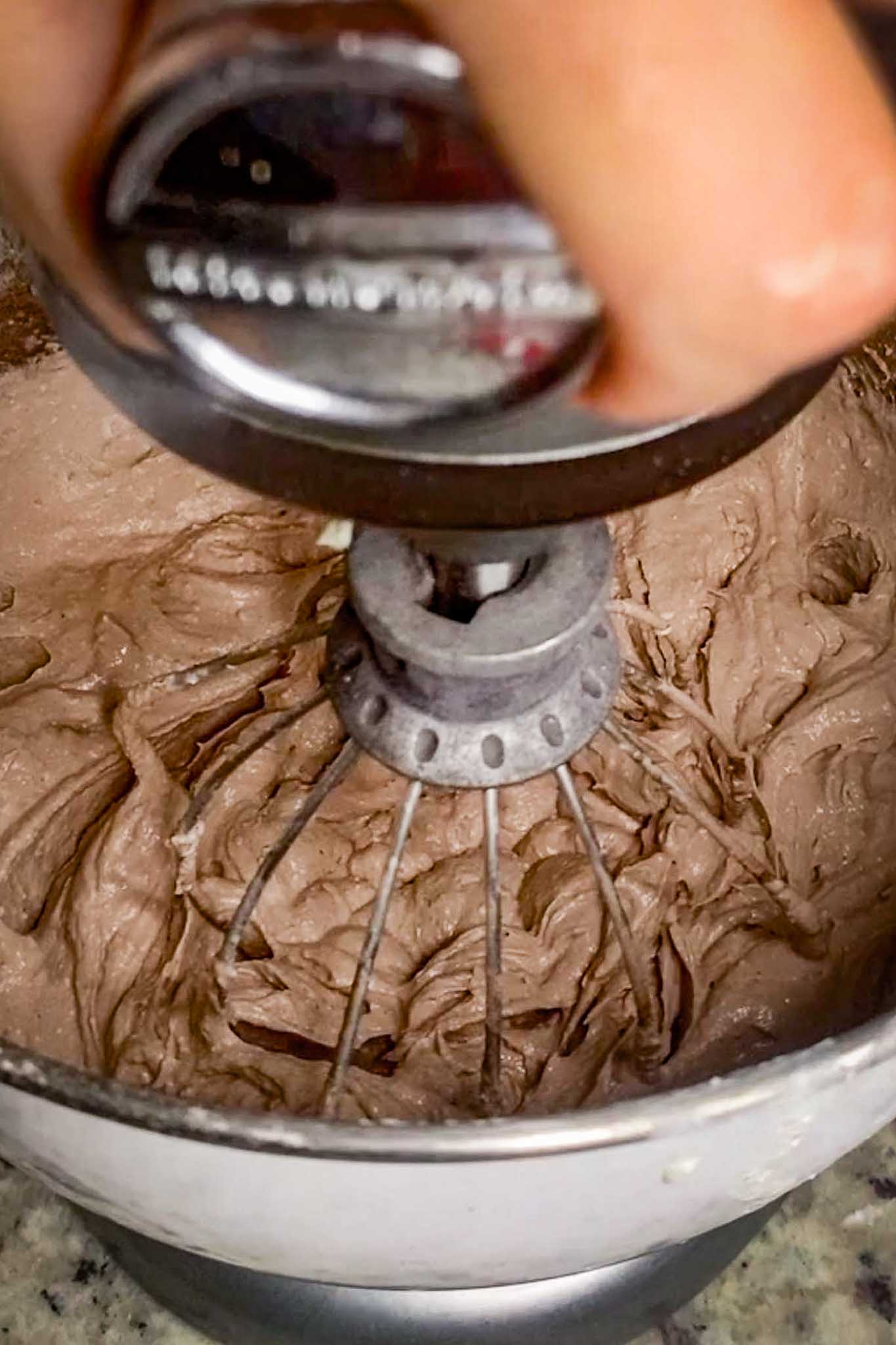 Then add the chocolate pudding on high speed. If it is not thick enough, add more of the chocolate pudding powder until stiff peaks appear and you have an airy mousse.