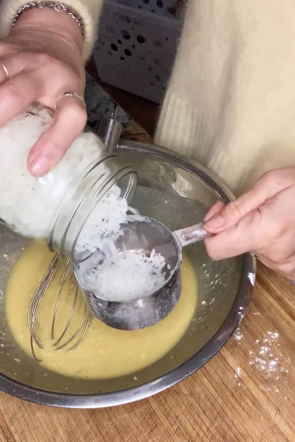 Stir in the coconut, vanilla, flour, milk, and salt until fully combined.