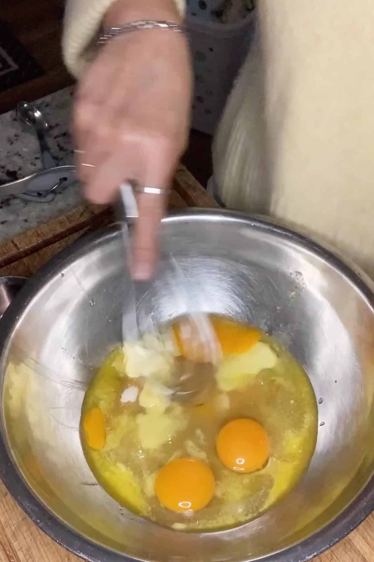 In a large bowl, whisk together the sugar and melted butter. Add the eggs one at a time, mixing well after each addition.