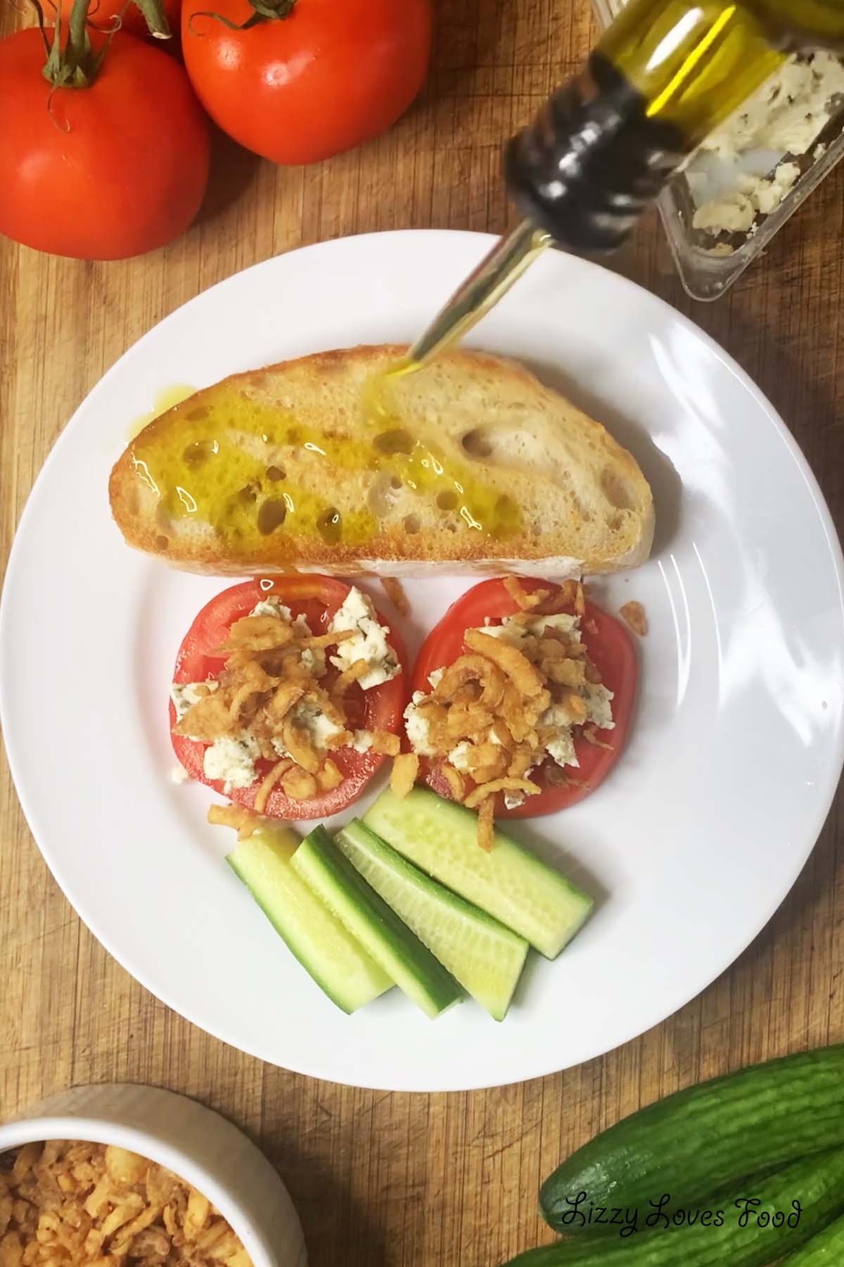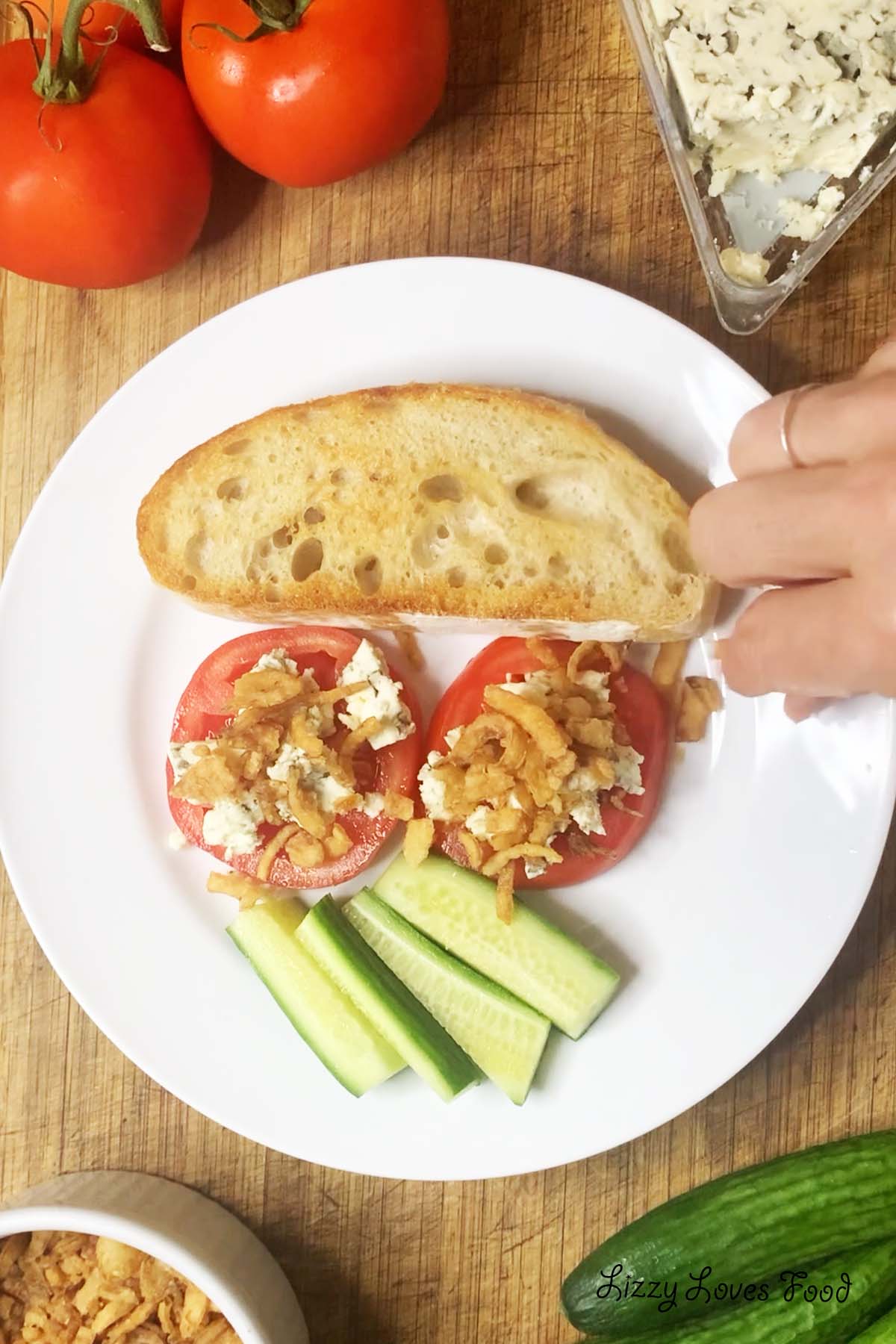Combine: Place tomato, then scrubble blue cheese on top, sprinkle crisp onions on top of the cheese
