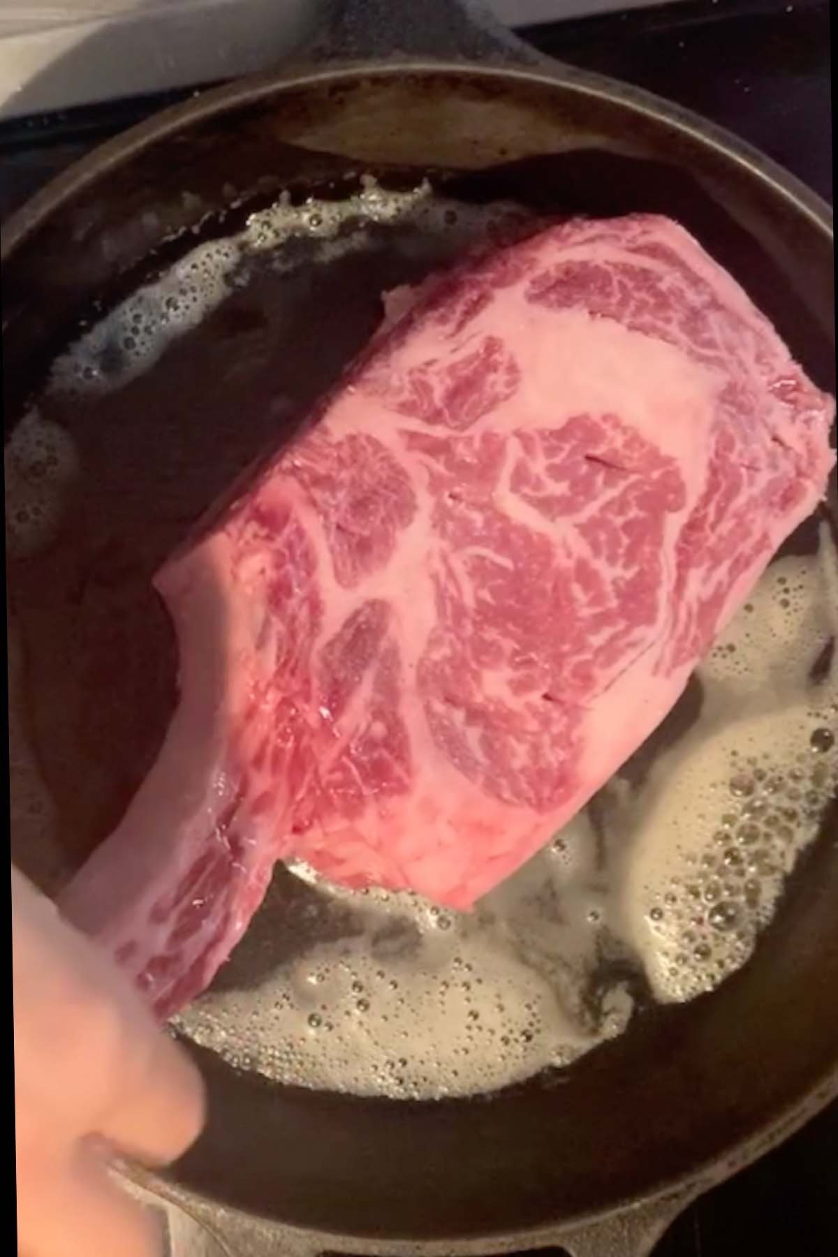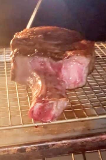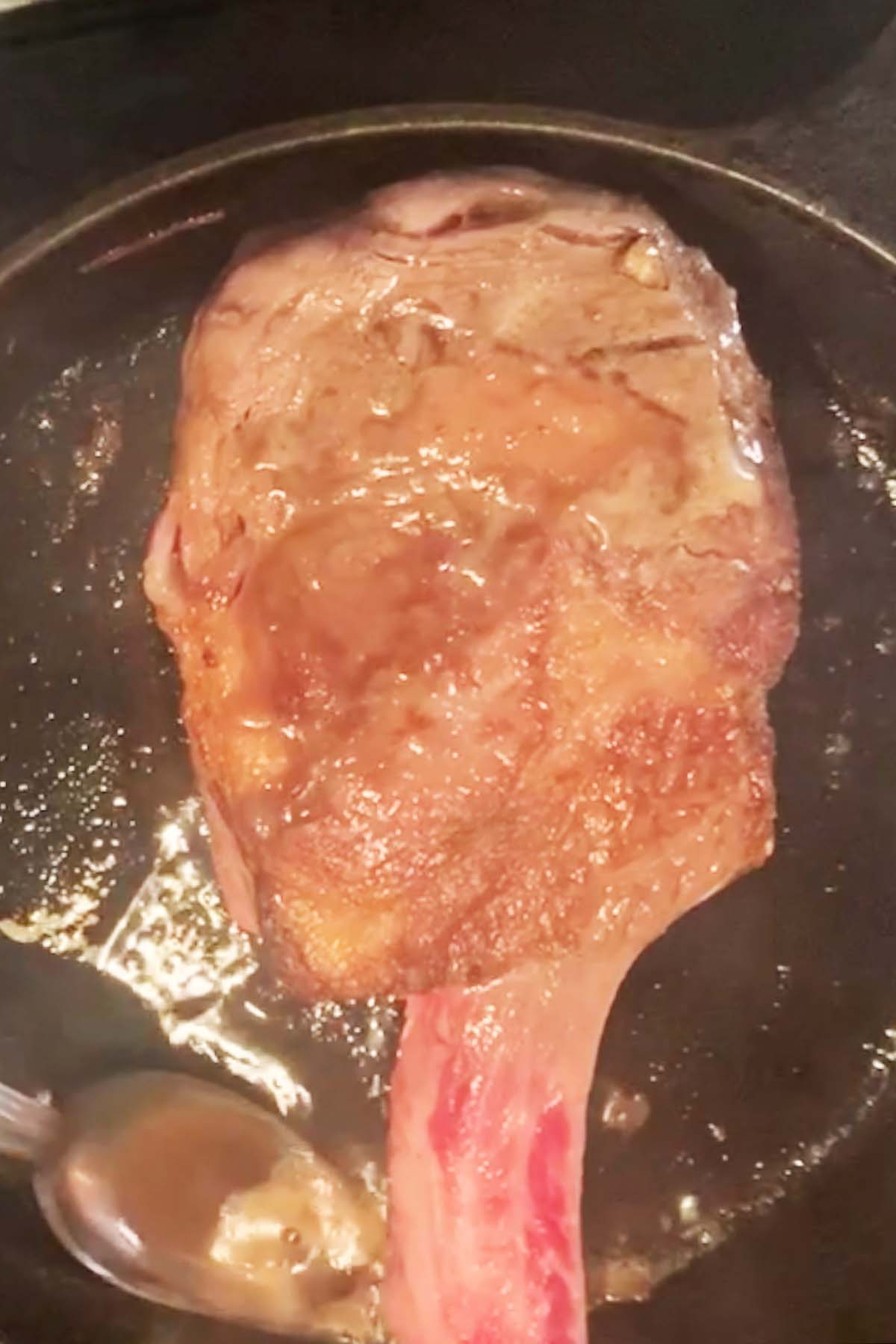 Sear 2–3 minutes on one side and then reverse sear method until a deep brown crust forms on all sides